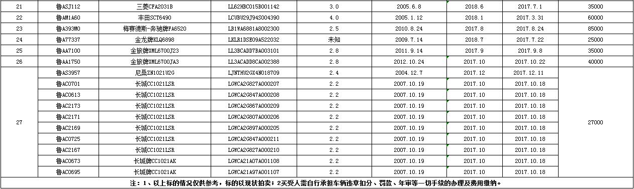 意向競買者請于2017年8月27日16:00之前將拍賣保證金10000元/輛交至以下賬戶(戶名:金諾國際拍賣有限公司,開戶行:齊魯銀行濟南歷城支行,賬號:000000726003800003937),準備有效身份證明(個人:身份證原件及復印件;法人:營業執照復印件)聯系本公司辦理競買登記。