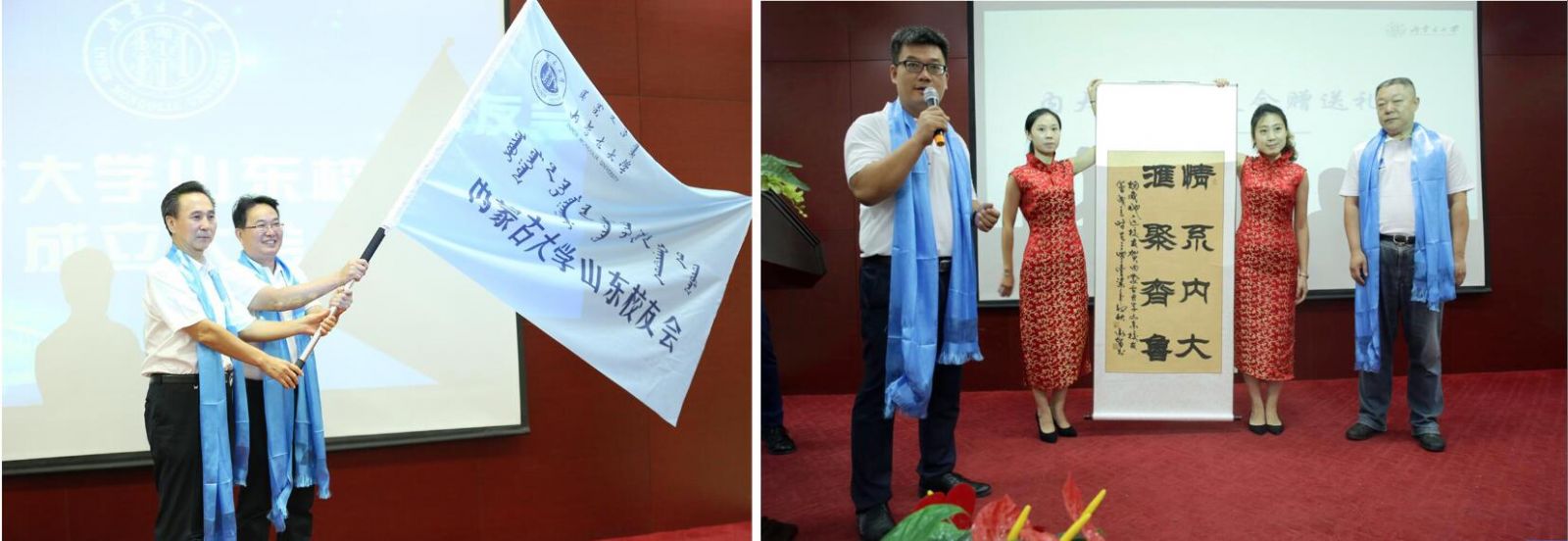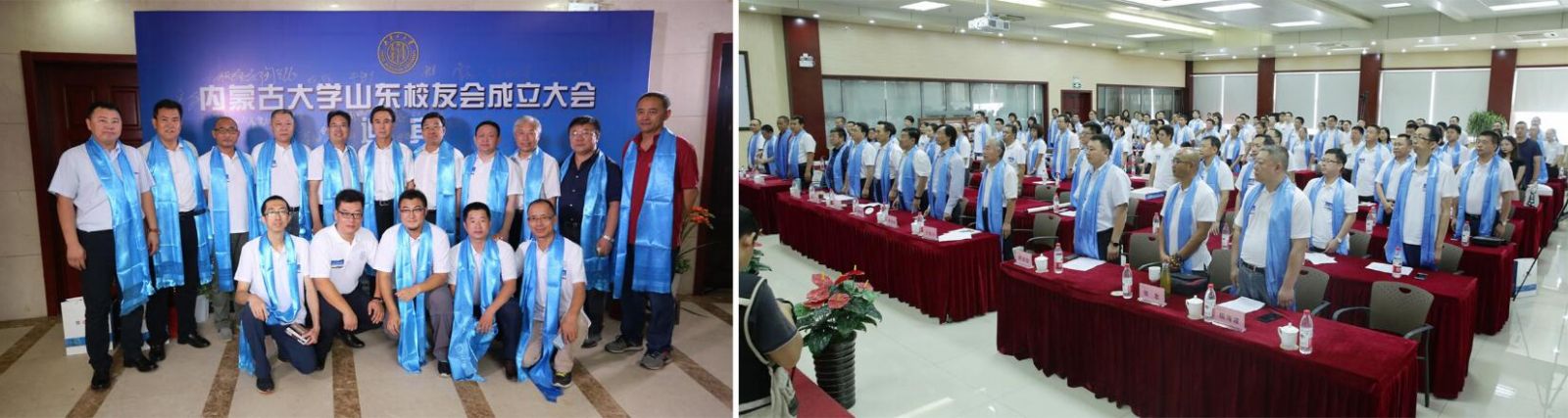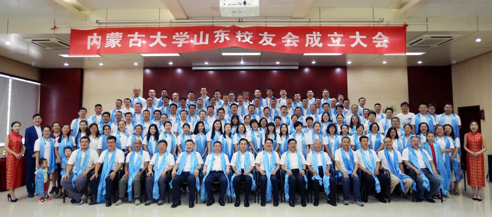 上午10點,大會在內蒙古大學校歌中正式拉開帷幕。校友們集體觀看內蒙古大學紀錄片;內大90級歷史系校友、內大山東校友會籌委會主任鄧剛作籌備工作報告;大會表決通過了內蒙古大學山東校友會章程;公布了內大山東校友會首屆理事會名單和校友會首任會長、副會長、秘書長、副秘書長的名單;內大副校長、內大校友總會會長鐵勇為山東校友會授旗,林擘會長代表內大山東校友會接受會旗;內大呼和浩特校友會會長、內大文學與新聞傳播學院原黨總支書記王俊川代表兄弟校友會致辭;煙威校友會向山東校友會送上“情系內大、匯聚齊魯”的書法作品;96級文史哲基地班校友王莉代表山東校友發(fā)言;內大山東校友會首任會長林擘致辭,并帶領全體到會校友領讀內蒙古大學山東校友會成立宣言;內蒙古大學副校長、內蒙古大學校友總會會長鐵勇代表學校發(fā)表重要講話,對山東校友會提出殷切希望。最后,鐵勇副校長等校領導、嘉賓和與會所有人員進行了集體合影,內蒙古大學山東校友會成立大會在一片溫馨和諧的氣氛中結束。