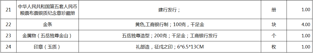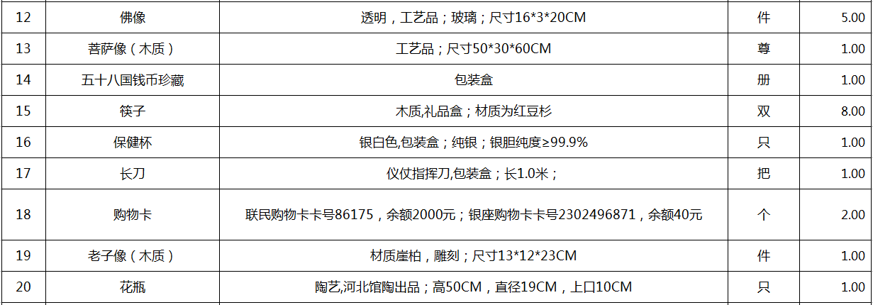 9、存貨物品一宗(包括木質雕刻類、玉石擺件類等),詳見清單。參考價18.1萬元,保證金3萬元。