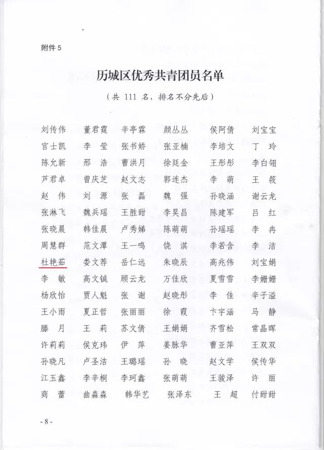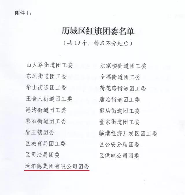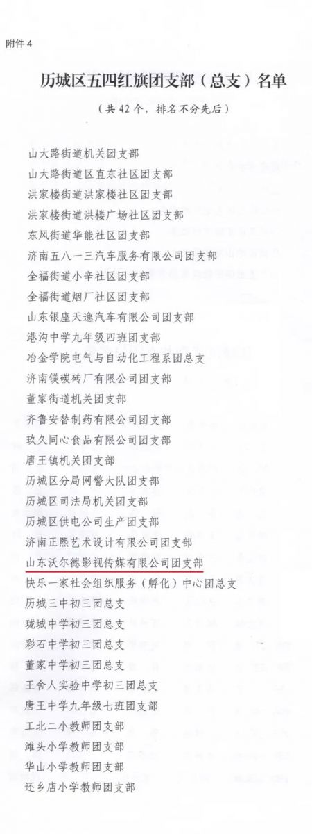 其中沃爾德集團團委被授予“歷城區紅旗團委”榮譽稱號、“山東沃爾德影視傳媒有限公司團支部”被授予“歷城區五四紅旗團支部(總支)”稱號。除了以上集體稱譽的之外,還對先進個人典型作出表彰。沃爾德集團團委書記王亞菲、副書記楊帆二人榮獲“歷城區優秀共青團干部”;集團團委委員杜艷茹榮獲“歷城區優秀共青團員”;程倚天榮獲“歷城區優秀青年志愿者”。