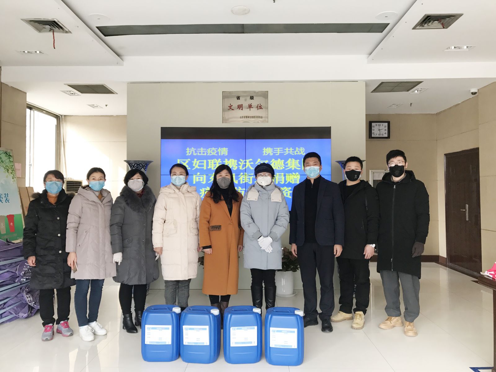 2月7日,在抗擊疫情的關鍵時刻,沃爾德集團婦聯副主席、金諾國拍總經理位琳及集團代表,先后來到東風街道、洪家樓街道、山大路街道、全福街道、郭店街道辦事處,代表集團婦聯與歷城區婦聯一道,為基層送去消毒液防疫物資,為疫情防控保障貢獻巾幗力量。