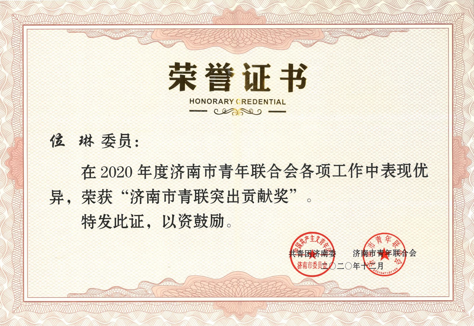會上表揚了2020年濟南市青聯杰出成就獎、突出貢獻獎、優秀青聯委員、青聯優秀秘書長、青聯活躍界別組。金諾國際集團總裁位琳在2020年度濟南市青年聯合會各項工作中表現優異,榮獲“濟南市青聯突出貢獻獎”。