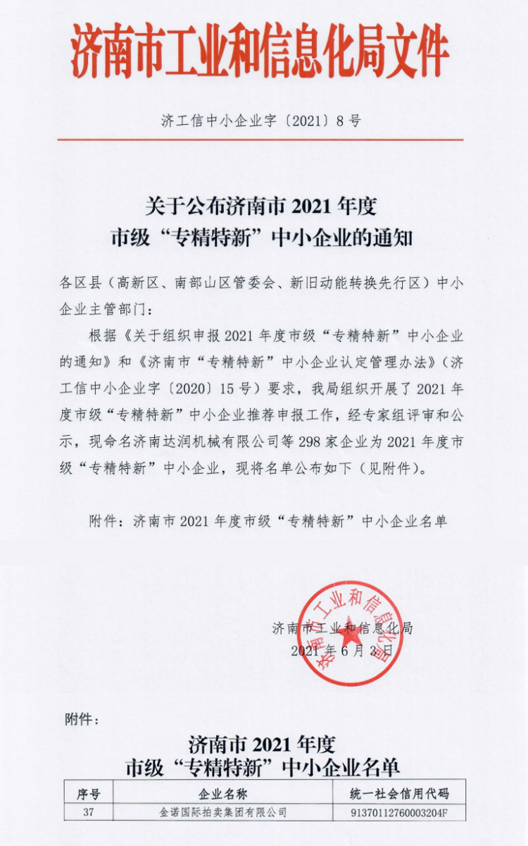 根據《關于組織申報2021年度市級“專精特新”中小企業的通知》和《濟南市“專精特新”中小企業認定管理辦法》要求,我公司經過企業信用評價、資料審核、評定指標統計分析等多個環節審核,近日,濟南市工業和信息化局正式公布了2021年“專精特新”中小企業名單,金諾國際拍賣集團有限公司憑借在企業創新發展方面的突出成就順利入選,被評為2021年度濟南市“專精特新”企業。