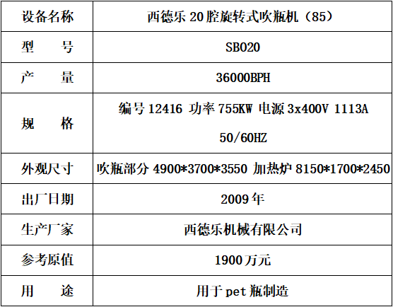 標的一:西德樂20腔旋轉式吹瓶機,起拍價 160萬元(不含稅),標的設有保留價,競買保證金15萬元。已拆機,設備完好。
