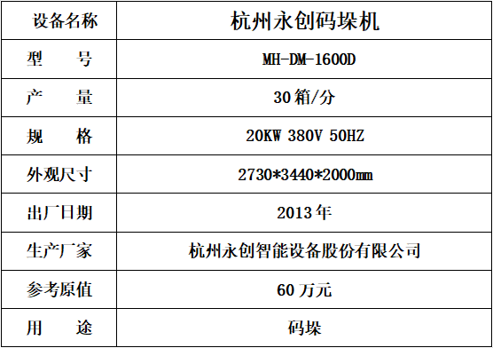 標的六:永創碼垛機,起拍價:15萬元(不含稅),標的設有保留價,競買保證金3萬元。已拆機,設備完好。