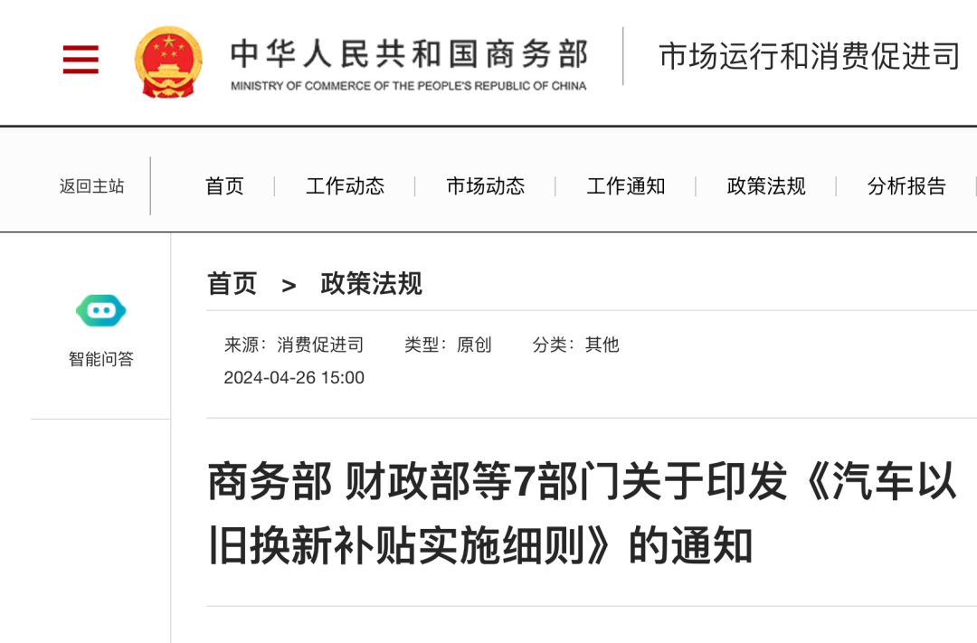 為貫徹落實《國務院關于印發(fā)〈推動大規(guī)模設備更新和消費品以舊換新行動方案〉的通知》(國發(fā)〔2024〕7號)精神,按照《商務部等14部門關于印發(fā)〈推動消費品以舊換新行動方案〉的通知》(商消費發(fā)〔2024〕58號)要求,更好實施汽車以舊換新補貼政策,現將《汽車以舊換新補貼實施細則》印發(fā)給你們,請貫徹執(zhí)行。